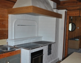 Kuchnia kaflowa z ceramiki w kolorze jasnego kobaltu. Piec kuchenny posiada bratrurę, w górnej części, niezależny piec chlebowy oraz długi obieg grzewczy, dzięki któremu grzana jest tylna ściana. Zastosowano żeliwne płyty grzewczę z której jedna jest z fajerkami umożliwiającymi przygotowanie dań nad ogniem. Cała konstrukcja funkcjonuje na jednym kominie do którego poprzez system zasuw i szybrów jest kierowany dym z paleniska. projekt: Marcin Deręgowski